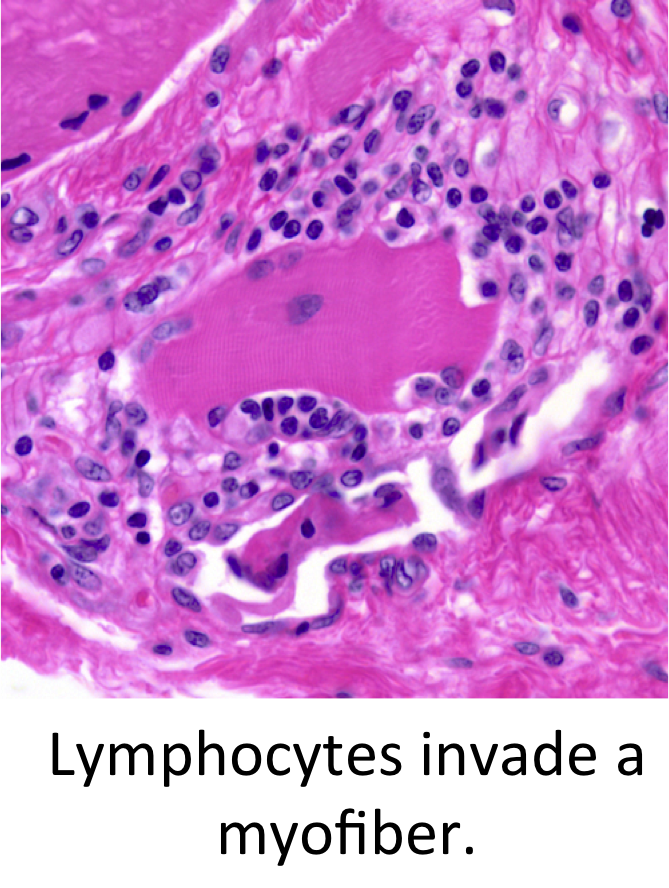 As opposed to polymyositis that shows Endomysial inflammation (CD8+ T cells) with necrotic muscle fibers