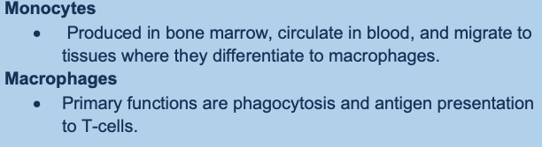 Monocytes → migrate to tissue → macrophages → phagocytosis and antigen presentation to T cells