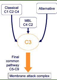 C3 activation → final common pathway C5-9 → MAC formation → MAC makes pores in bacteria