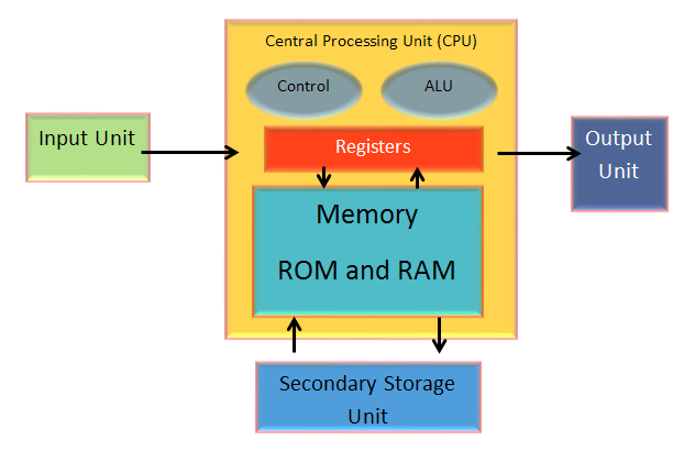 Inside the CPU: Control, ALU, Registers, Memory- ROM & RAM).