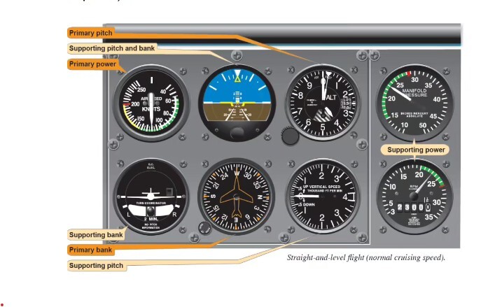 The __________ is primary for pitch, the __________ is primary for bank, and the __________ is primary for power during straight-and-level flight. (IFH Chapter 5)