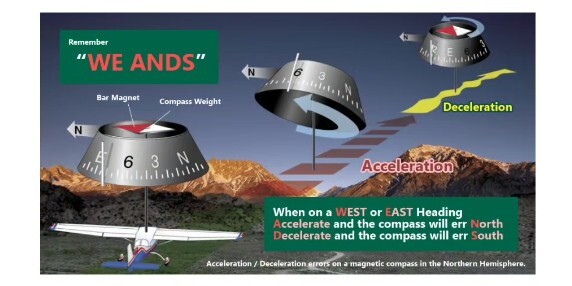 In other words when on a westerly or easterly heading, accelerate and the magnetic compass will show a turn to the north, decelerate and it will show a turn to the south.
