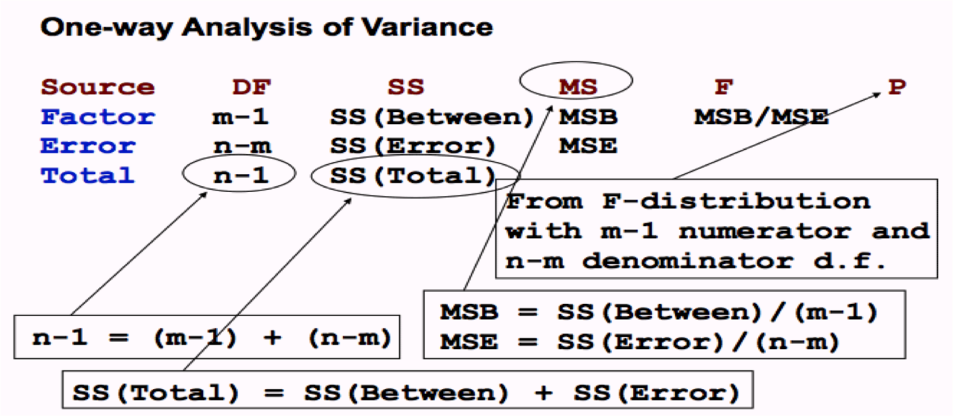 For One-Way ANOVA If: n= total data points collected, and m= number of groups being compared, & [] example if there was 3 groups and 30 points of data: