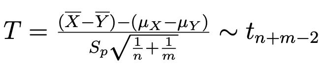 Give the test statistic needed to construct a (1-α) confidence interval for the difference in means between two independent normal distributions and where we don’t know the variance