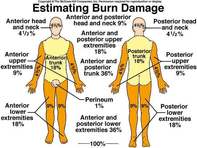 The extent of a burn expressed as a percentage of the body surface area. Assuming that the body surface area is 100 percent, head is 9%, front torso 18%, back 18%, lower extremities 18%, genitals 1%