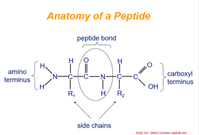 Sketch a two amino acids linked with a peptide bond and identify the amino terminus, carboxyl terminus and side chains