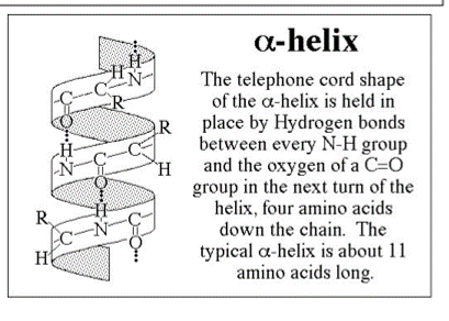 Secondary structure is the folding of the polypeptide chain due to hydrogen bonding into an alpha helix structure, resembling a coiled spring, or a beta pleated sheet.