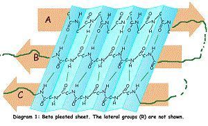 add pic In the b-pleated sheet, the NH and C=O groups point out at right angles to the line of the backbone. This almost two dimensional sheet is pleated, like the bellows of an accordion