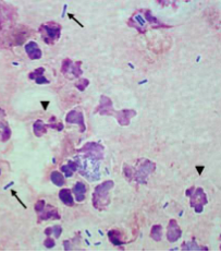 Neutrophils that have been damaged or are in the process of dying. Along with Gram positive straight rods