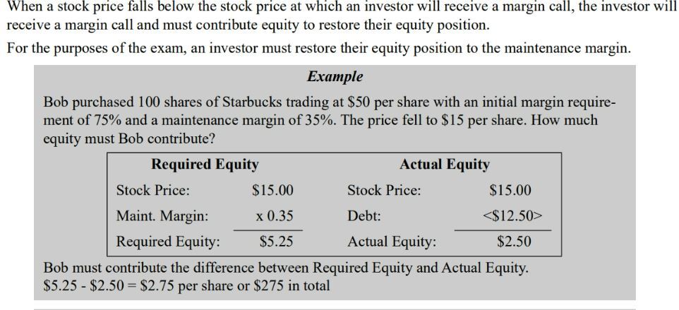 To purchase 100 shares of Starbucks trading at $50 per share with an initial margin requirement of 75%, Joe must contribute 100 x $50 x 0.75 = $3,750, and he will borrow $1,250 (100 x $50 x 0.25) from his broker