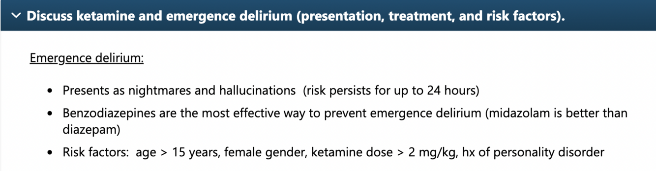 Risk factors for ketamine delirium and presentations. Time frame?