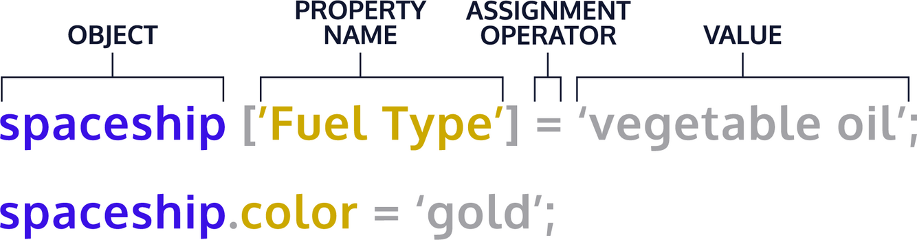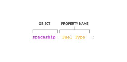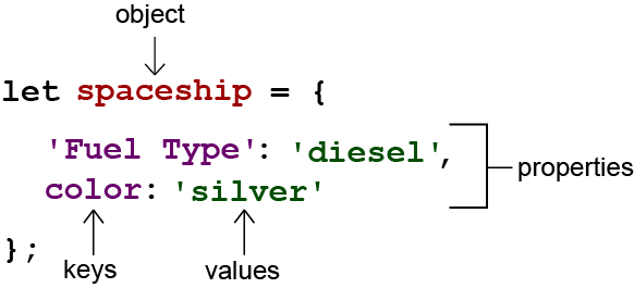 The spaceship object has two properties Fuel Type and color. ‘Fuel Type’ has quotation marks because it contains a space character. */