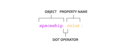 spaceship.type = ‘alien’; // Changes the value of the type property