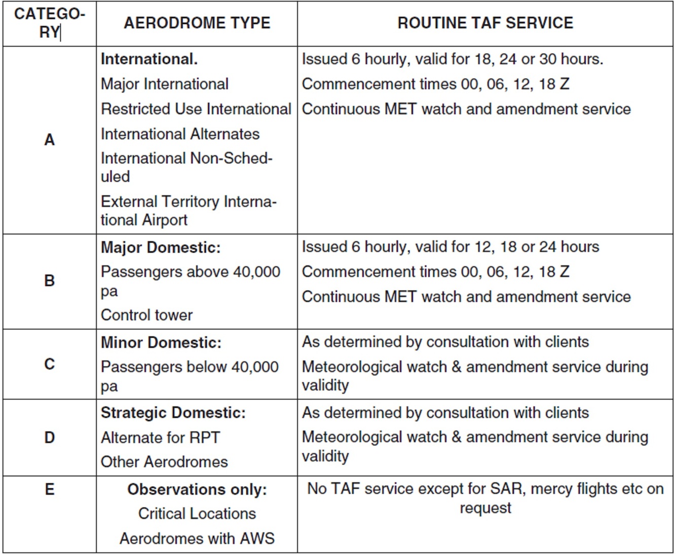 Aerodrome Forecast, Nil Aerodrome Forecast and Provisional Aerodrome Forecast respectively.
