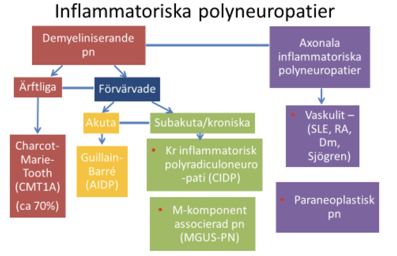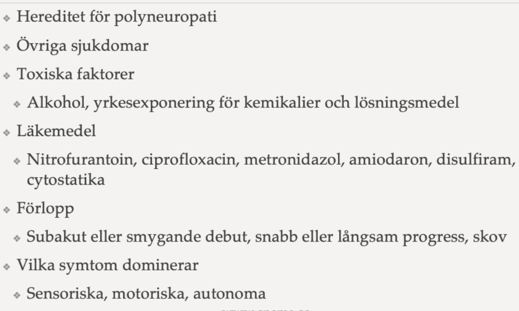 Vilka olika typer (orsaker) till polyneuropati bör man känna till? Ge några exempel på vad den bakomliggande orsaken är? (4p)