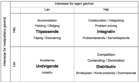 Tilpassende, Integrativ, Undvigende, Distributiv