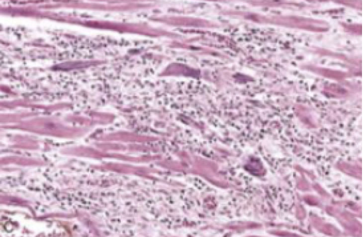 Histologi viser typisk ødem og tallrike lymfocytter mellom myocytter.