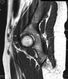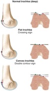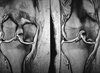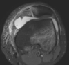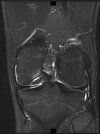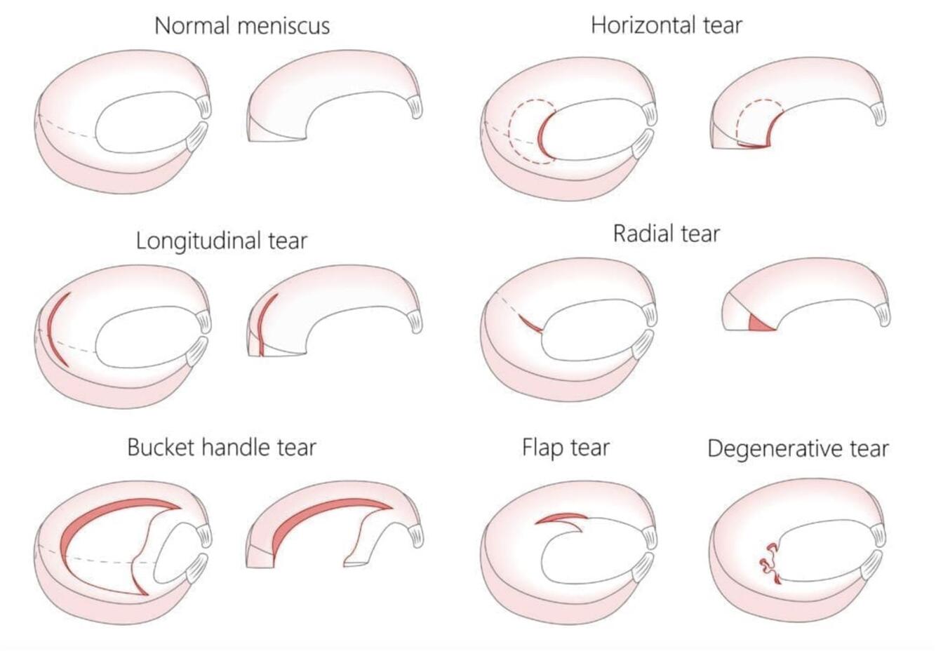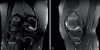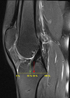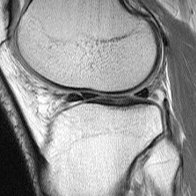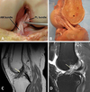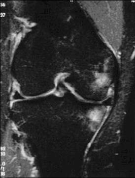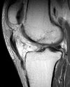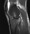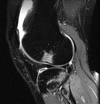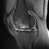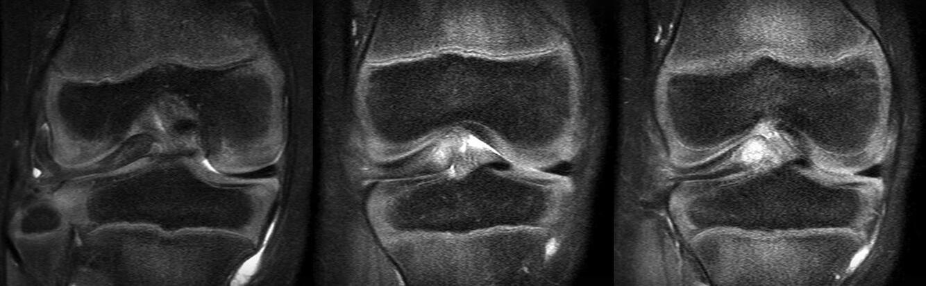 * Sagittal MRI images showing meniscal continuity in three 5mm sagittal images (“bow-tie sign”) is diagnostic.