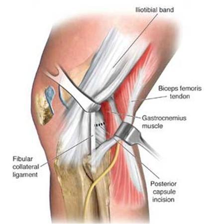 splliting b/t IT band and biceps tendon then retract gastrocs posteriorly