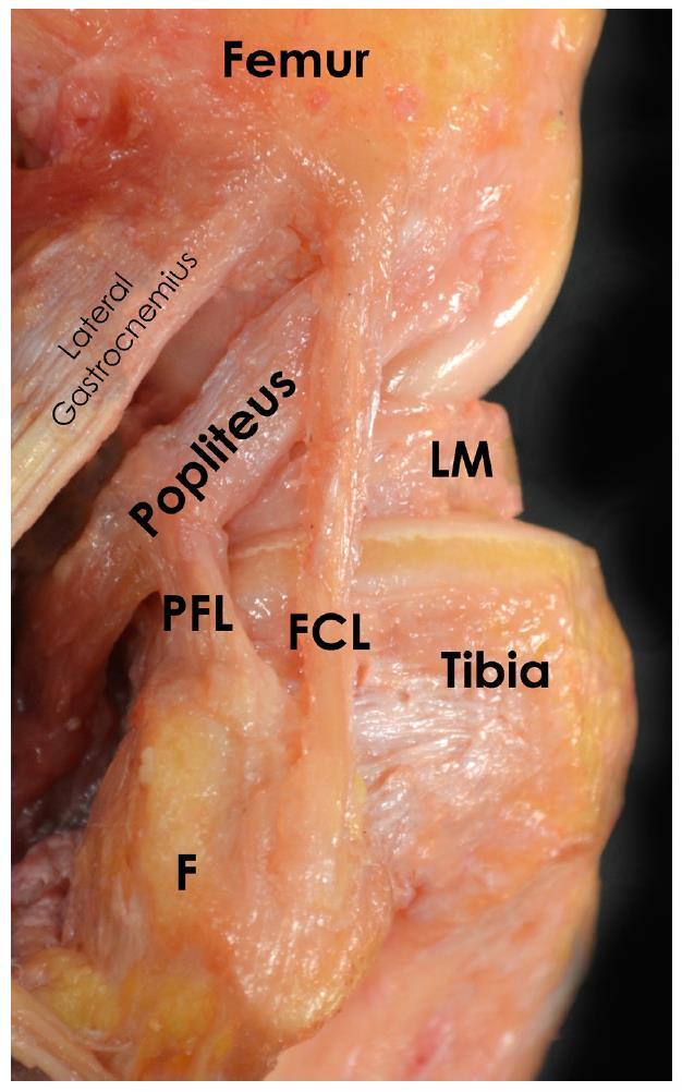 posterior-lateral capsular exposure needed to protect the neurovascular structures and allow suturing for an inside-out lateral meniscal repair is performed by developing the interval between the iliotibial band and biceps tendon. The lateral gastrocnemius is then retracted posteriorly and medially where it helps protect the neurovascular structures. Splitting below the biceps tendon puts the peroneal nerve at risk.
