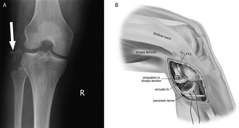 avulsion fracture of the fibula (arcuate fracture ) or femoral condyle