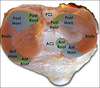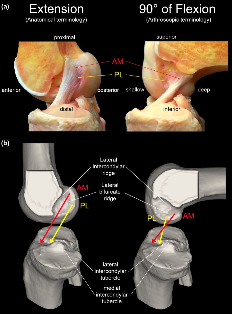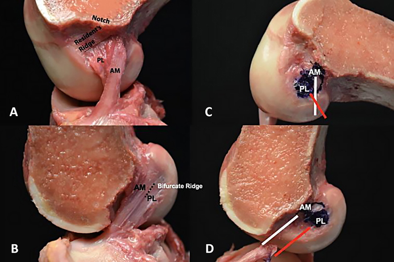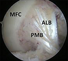 Arthroscopic image of a knee shows the posterior cruciate ligament bundle origins. The anterolateral bundle (ALB) and the posteromedial bundle (PMB) are observed at their origin on the lateral side of the medial femoral condyle (MFC), or the medial intercondylar notch.