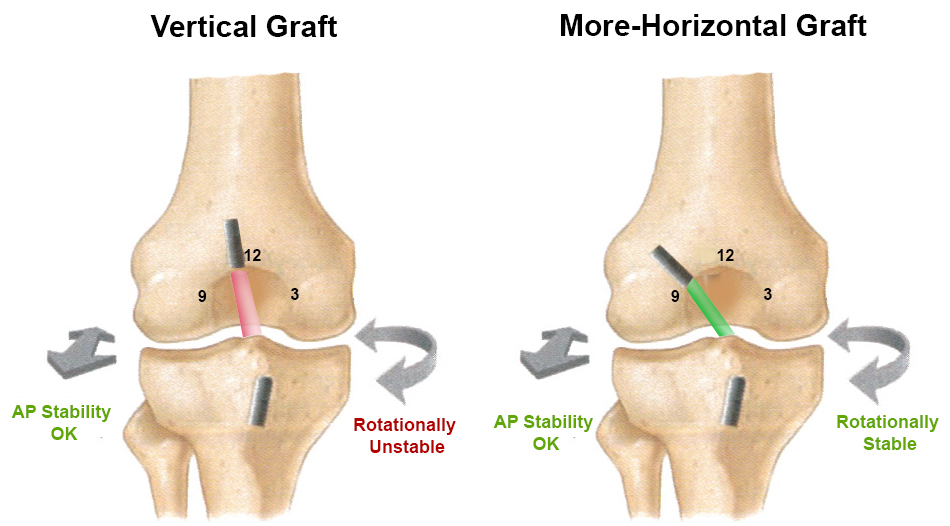 vertical tunnel placement: 12oclock position in the notch as opposed to lateral wall 10/2 oclock, causes rotational instability, positive pivot shift