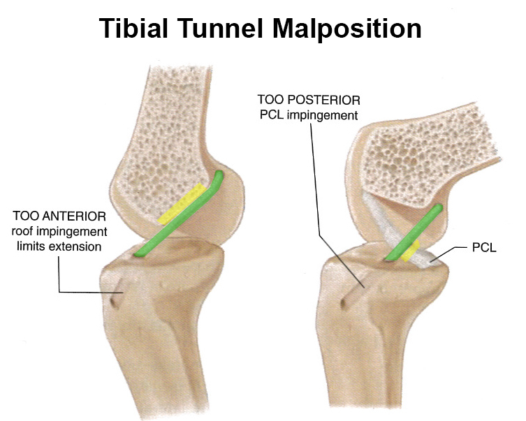 Anterior tunnel placement, tight in flexion loose in extension, failure to clear resident ridge