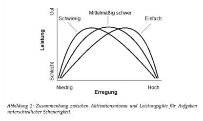 Aber: Bei einfachen Aufgaben erreicht man die beste Leistung bei hohem Aktivierungsniveau, bei schweren Aufgaben bei niedrigem