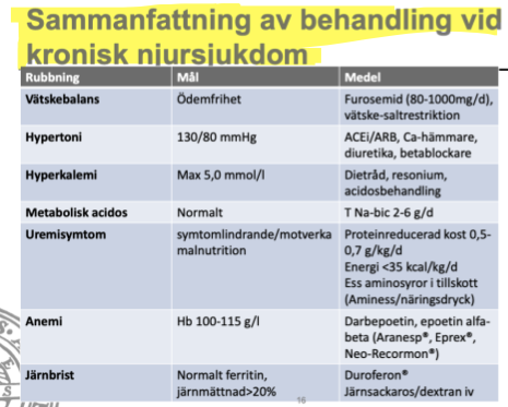 Hyperkalemi uppstår hos CKD pga minskad filtration av kalium (samt RAAS-blockad som kan bidra till hyperkalemi). Kaliumreducerande kost är förstahandsbehandling vid hyperkalemi vid CKD.
