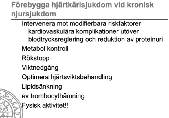 Vid CKD behandlar man för att förebygga kardiovaskuär sjukdom med sedvanlig preventiv behandling. Nämn den klassiska preventiva behandlingen kortfattat. Ish 7 saker.