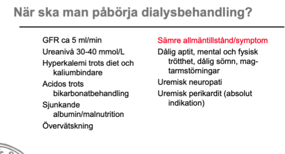 Relativa indikationer för dialys vid CKD är t.ex. GFR ca 5 ml/min eller ureanivåer på 30 mmol/L och vid andra rubbningar som t.ex. acidos och hyperkalemi som ej kan behandlas med läkemedel.