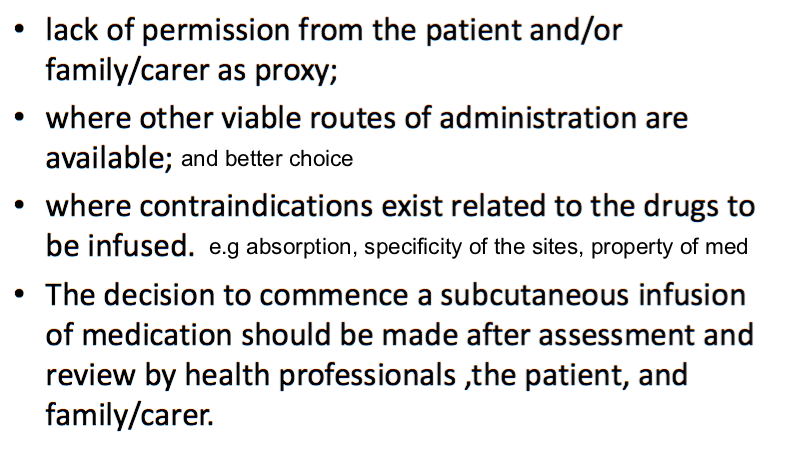 • allows continuous supply of arange of drugs bypassing the gut and associated problems with swallowing and malabsorption • can provide more stable plasma levels of drugs and better symptom control as peaks and troughs of intermittent drug administration are avoided • generally involves a small,portable or relatively portable battery operated pump that delivers medications at an accurately controlled rate provides versatility offering a convenient, accessible alternative for continuous administration of medications; • can be used for ambulant patients with most devices able to be worn relatively unobtrusively, not interfering with patients wanting to continue with their normal daily activities; • can provide continued management of symptoms removing the need for frequent interventions like repeated oral medications or injections at end of life.