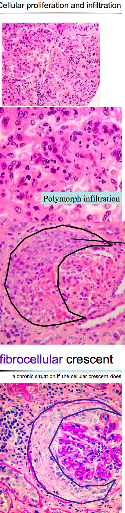 – Formation of crescent: an accumulation of cells composed of proliferating epithelial cells and infiltrating leukocytes (cellular crescent will develop into fibrocellular crescent containing collagenous tissues if not resolved entirely and became chronic)