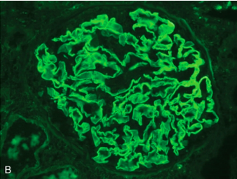 i) antibody against glomerular antigen (Heymann nephritis or membraneous nephritis; e.g. against PLA-2R)