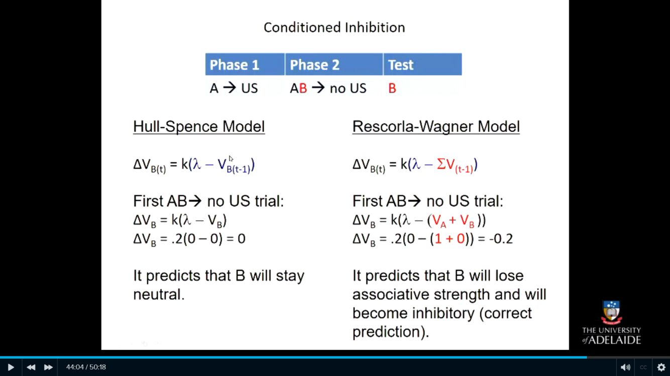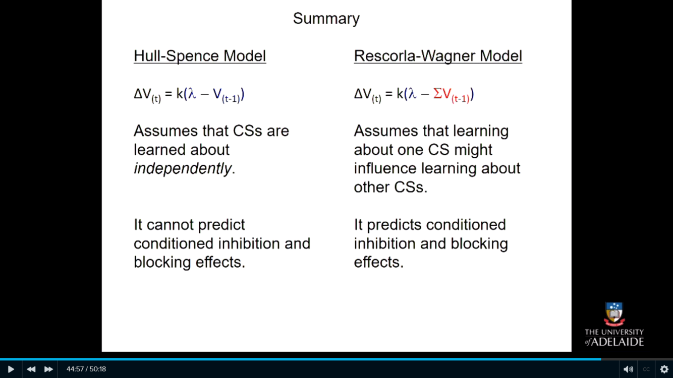 Summarise the difference between the Hull-Spence Model and the Rescorla-Wagner Model.