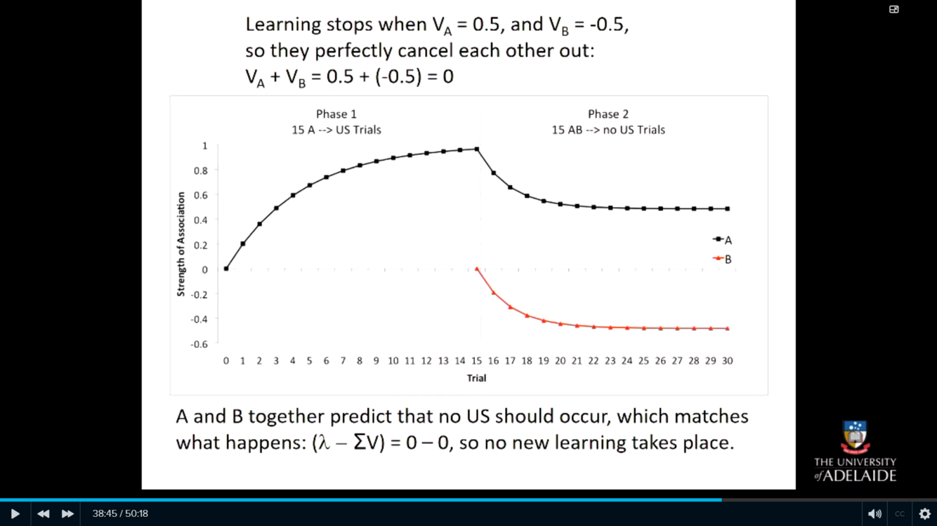 The animal has already learned to associate A with the US so the presence of B doesn’t change anything and is therefore unsurprising so there will be slow learning.