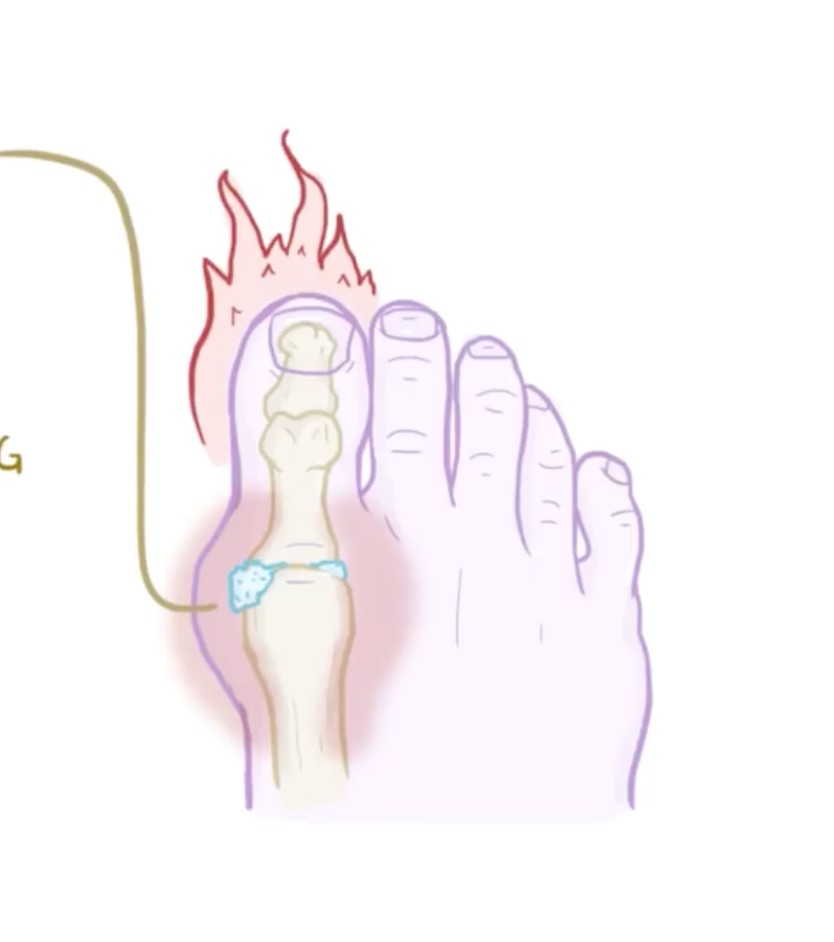 La présentation classique initiale de la goutte est par l’atteinte de la première articulation métatarsophalangienne (MTP) que l’on nomme podagre. 75% des gouttes débutent avec un podagre et 90% vont éventuellement faire un podagre au cours de l’évolution de la maladie.