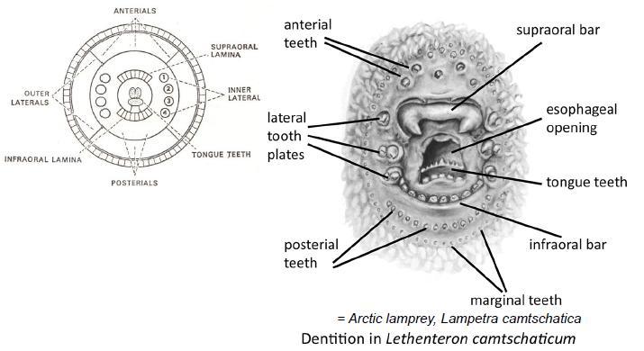 Help Petromyzontidae seal itself to prey through suction while teeth help to hold onto prey.