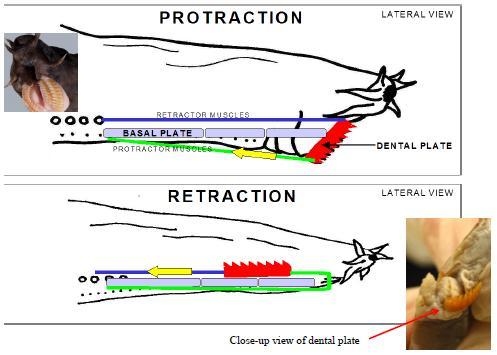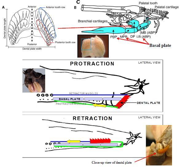 Hagfish feeding apparatus includes a dental plate, structural cartilage, and feeding muscles. The dental plate is the only motile element of the apparatus which is situated above the BASAL PLATE. Function of the basal plate is a series of cartilage that supports the dental plate and muscles pull the dental plate in and out of the oral cavity.