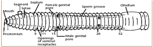 The prostomium (lip) is a fleshy lobe that extends over the mouth, wh is located on the ventral surface of the first segment.