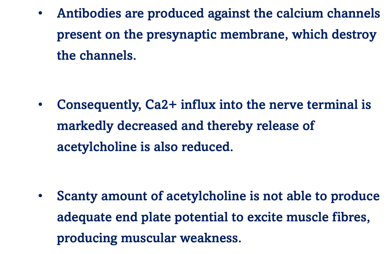 antibodies attack the calcium channels present on the presynaptic membrane, which destroys the channels.