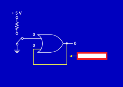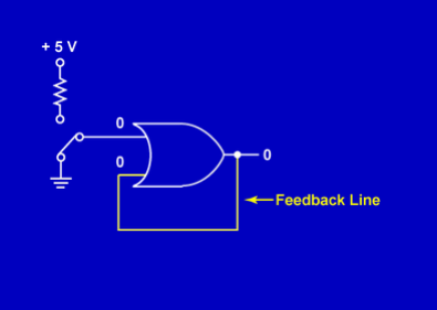 The circuit below is nothing more than a single OR gate with its output tied to one input leg. The other input leg is tied to a switch. The switch is used to apply either ground or 5 volts. The line tying the output to the input is called a feedback line. The purpose of the feedback line is to provide a path for the output of the gate to be returned to the input.