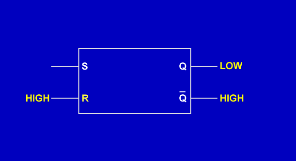 A HIGH applied to the R (RESET) input sets the output Q LOW and output Q HIGH.
