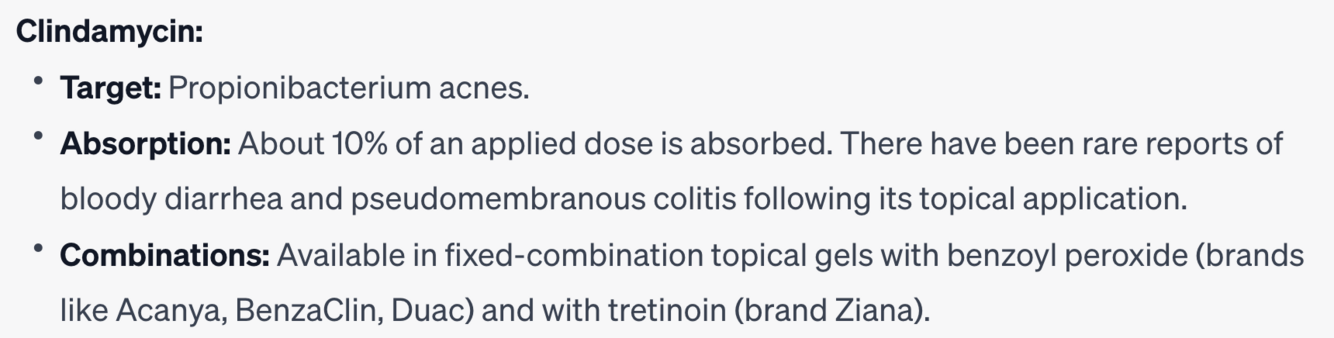 Which topical antibiotic targets Propionibacterium acnes and is available in a combination with benzoyl peroxide?
