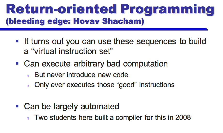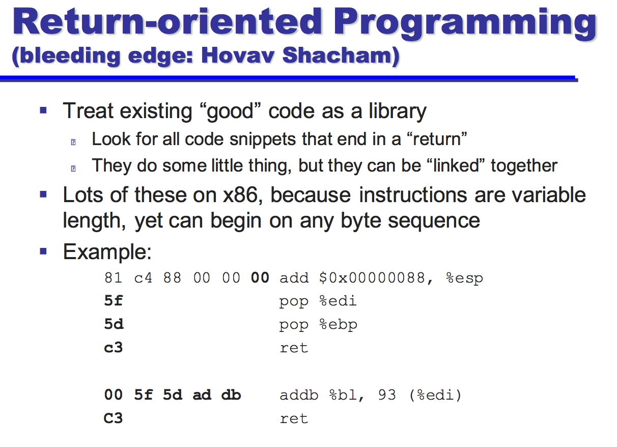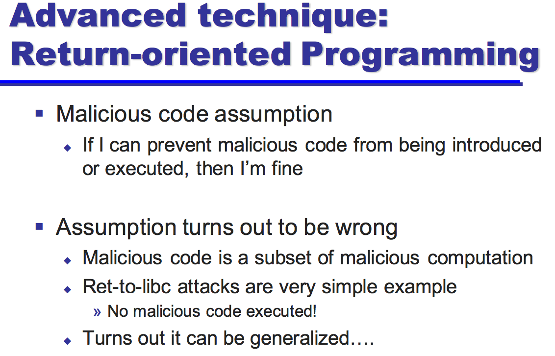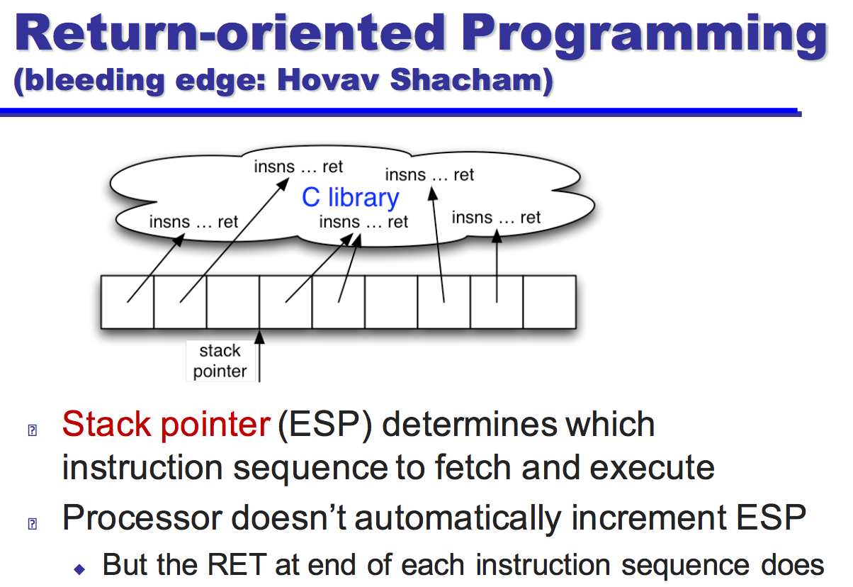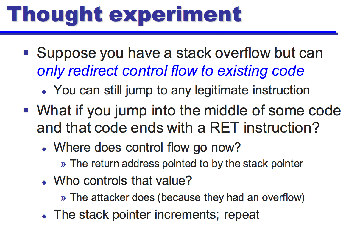 Suppose you have a stack overflow but can only redirect control flow to existing code? What if you jump into the middle of some code and that code ends witha RET instruction? Where does control flow go now? Who controls that value?