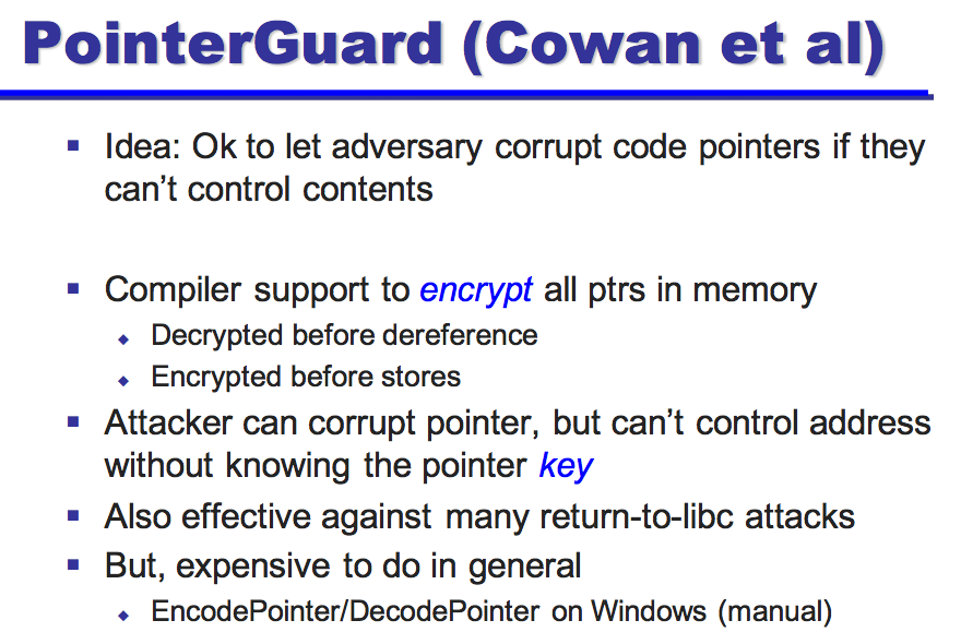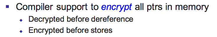 A defense against heap overflows and return-to-libc attacks that allow adversary to currpy code pointers but prevent them from controling the contents