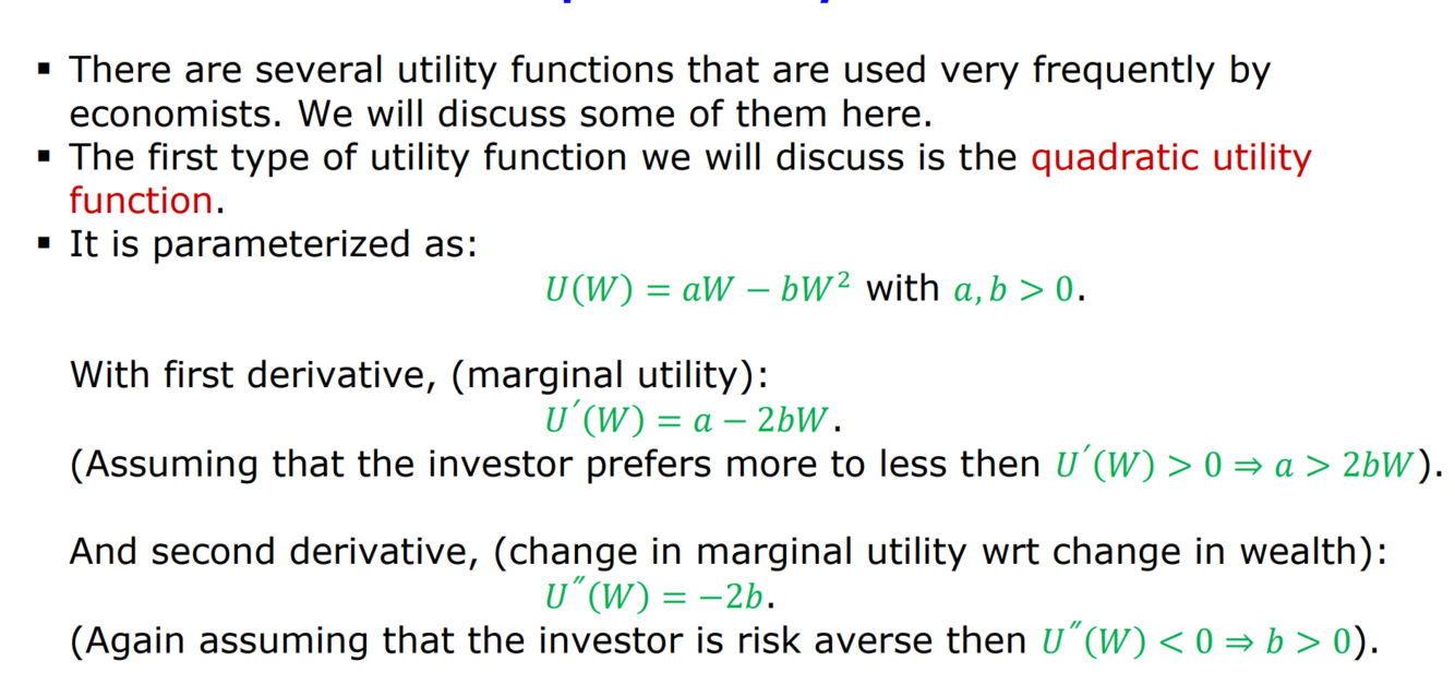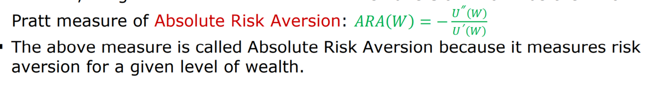 Second derivative: U’‘(W) = -W^-2 = -(1/W^2). Since U’‘(W) < 0 for W > 0, the function is concave meaning it represents a risk-averse individual.