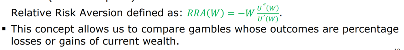 At what certain wealth W is 𝑈(𝑊) = 5? ⇒ √𝑊 = 5 ⇒ 𝑊 = 25. So CEW is 25. This implies that Risk premium is 𝐸(𝐺𝑎𝑚𝑝𝑙𝑒𝑝𝑎𝑦𝑜𝑢𝑡) − 𝐶𝐸𝑊 = 50 − 25=25.