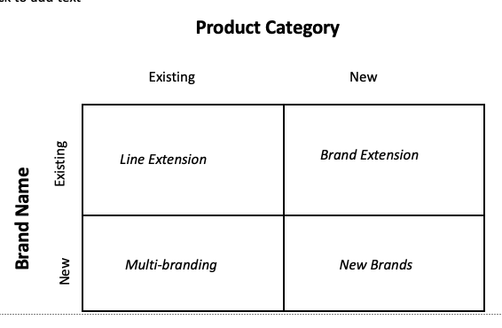 Line extension - Add more products to existing line Brand extension - Adding other product categories to the company - Apple computers to MP3 players Multibranding - one producer making different brands - Whirlpool making maytag, kitchen aid. New brand - new brand name with new category - risky